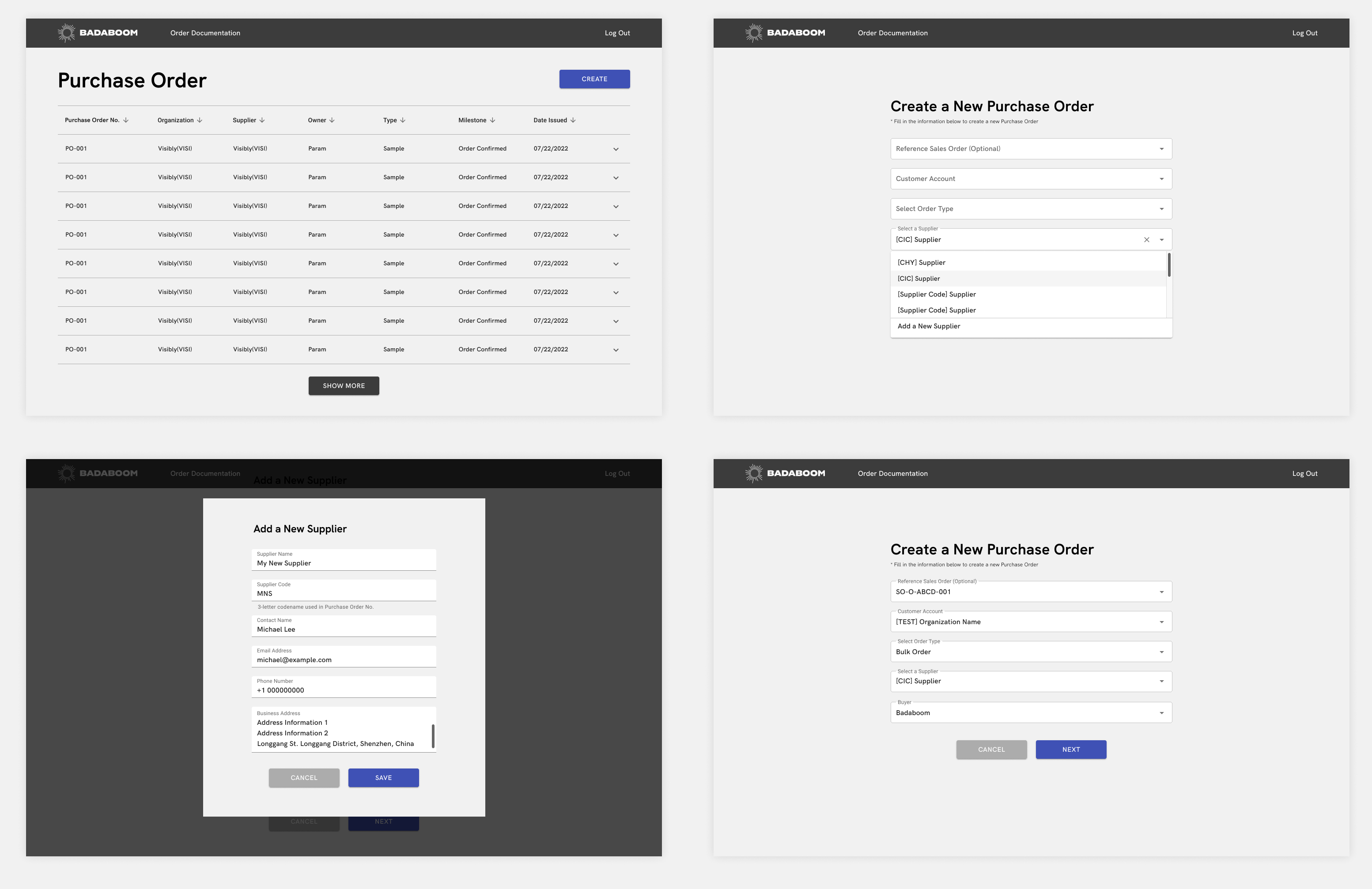 By grouping the "Order Details" "Shipping" "Buyer" and "Supplier " information together to form the first part of the information to shorten the page length so that users can quickly scroll down to fill in the Line Items.Add line item uses the same popup window modal as add supplier, rather than add a new blank line item after all the items.