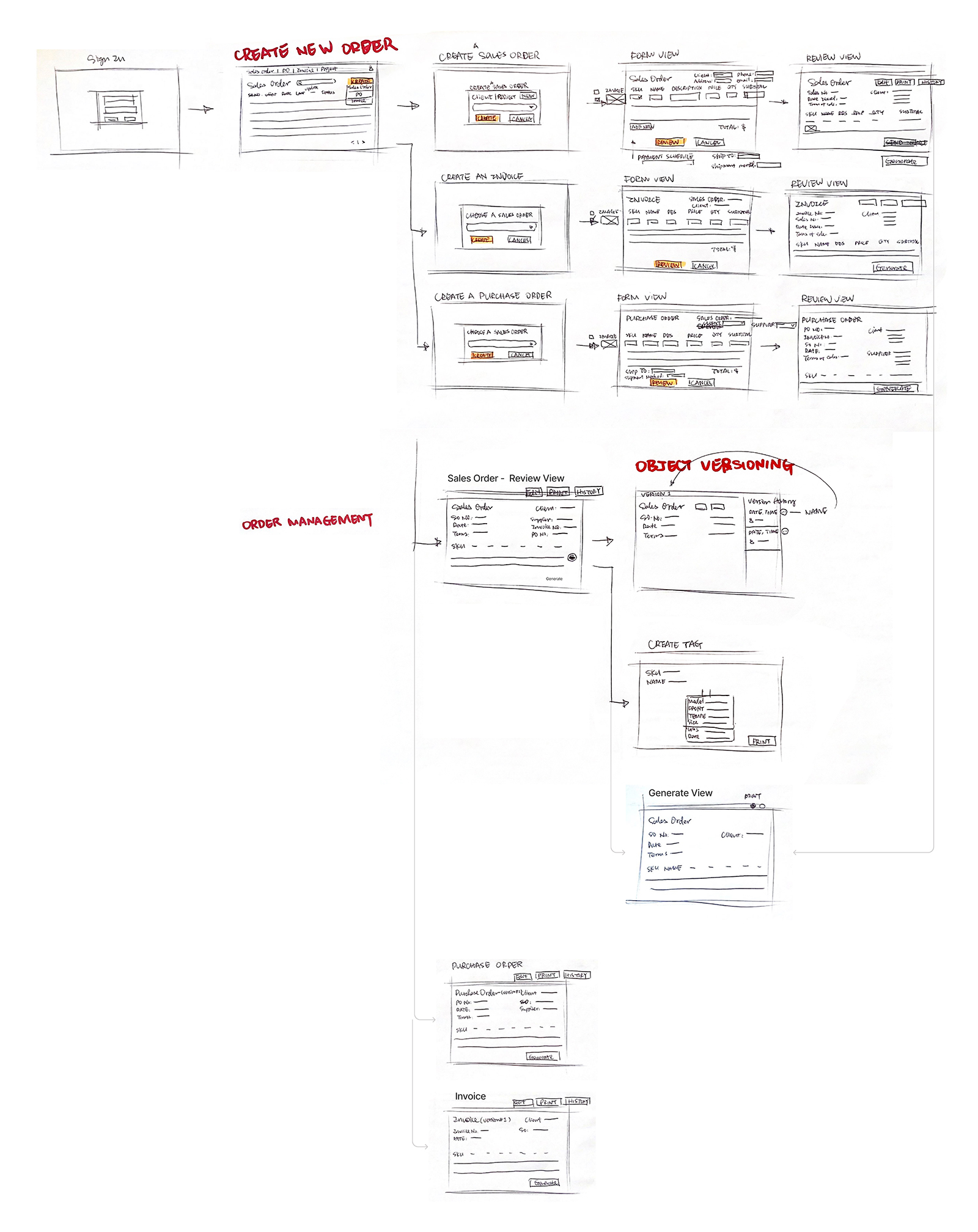 After gathering feedbacks from the team, I refined the flow to “Log in to the platform”, “Create a New Order”, “Edit Order Document” and “Object Version” where possible and to ensure all the information architecture is good based on team’s feedback. Furthermore, I could know percisely how many pages I needed to design.